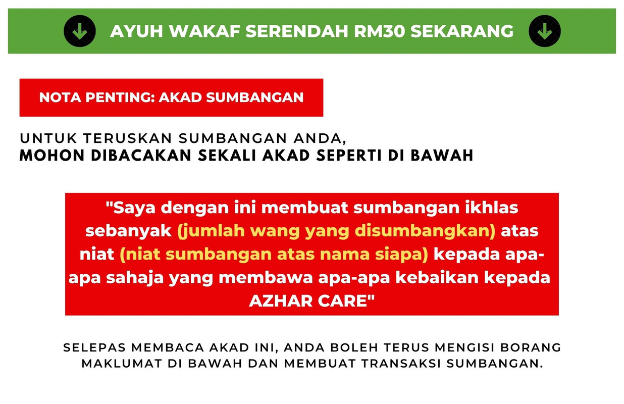 4. Jika ada sebarang pertanyaan atau masalah untuk isi borang ini sila hubungi: Pegawai Perhubungan Al Azhar Care: +601-11635 0997